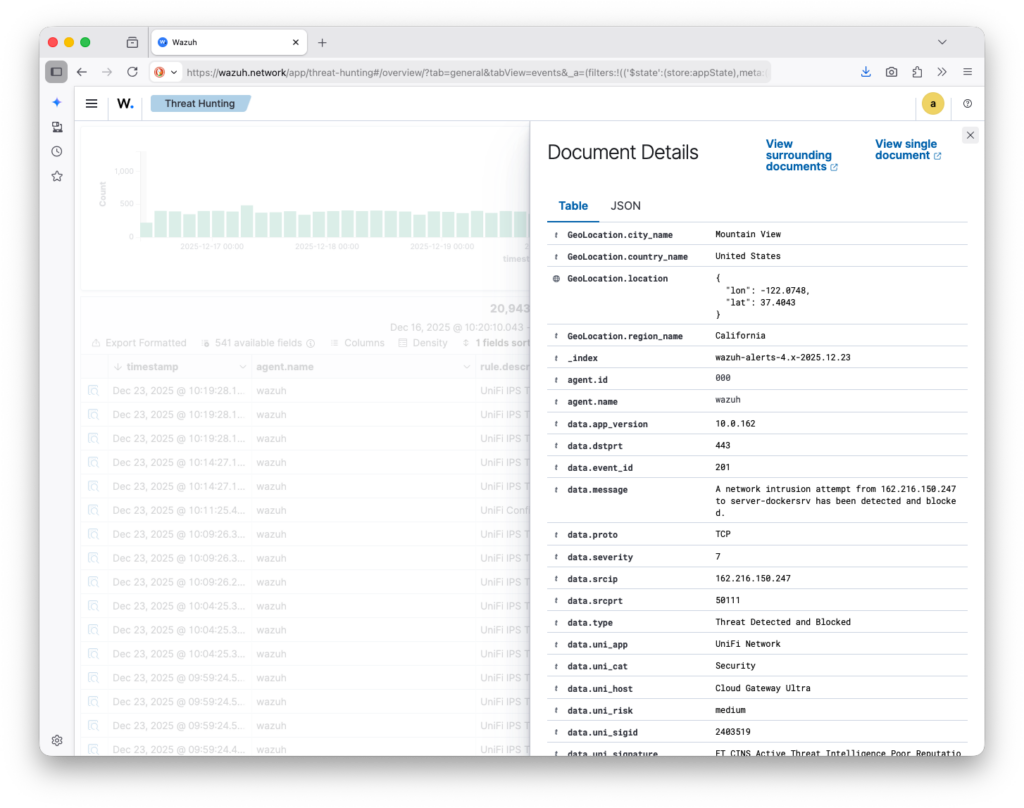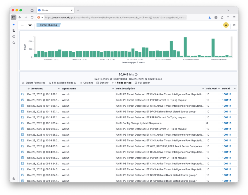 I sat down a number of times to create the necessary custom decoders and rules for this integration, but it wasn’t until recently, with inspiration from ph0tacular, that I got to a place I am quite happy with and wanted to share more broadly. As you will see in the following screenshots, my UniFi security events are now nicely displayed within Wazuh, allowing me to configure alerts, dashboards, and automated actions.